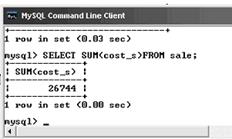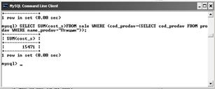 mysql> SELECT SUM(cost_s) FROM sale WHERE (cod_prodav=(SELECT cod_prodav FROM prodav WHERE name_prodav="Птицын"));