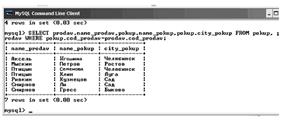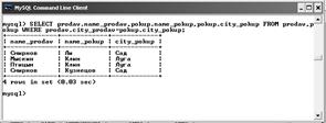 mysql> SELECT prodav.name_prodav, pokup.name_pokup, pokup.city_pokup FROM pokup, prodav WHERE pokup.cod_prodav = prodav.cod_prodav;