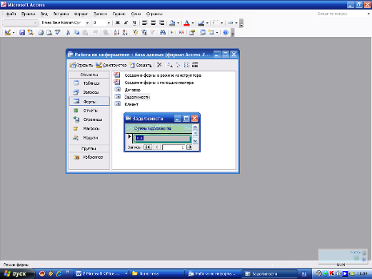 Часть работы посвящена изучению объектов интерфейса Access. Благодаря формам с разнообразными элементами Ваши базы данных «оживут», а мощные генераторы позволят распечатывать профессионально оформленные отчёты. Их можно будет сохранять и в файлах, чтобы потом продолжить работу с ними в Excel или Word. Вы узнали о том, как с помощью мастеров избежать рутинной работы по созданию простейших основных и подчинённых форм; как работать с мастерами создания отчётов.