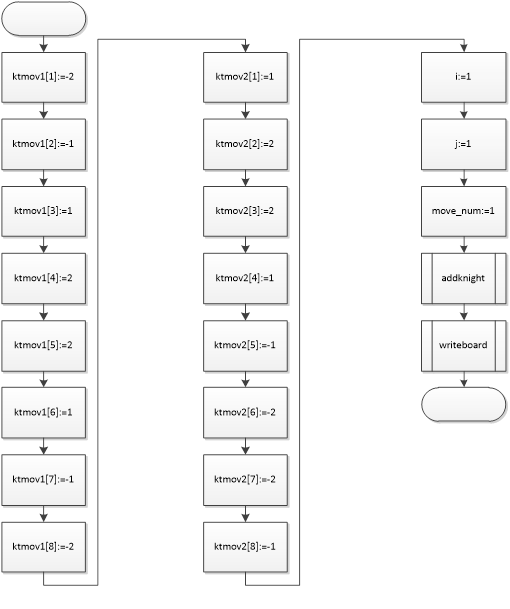 Кінь, що знаходиться в позиції (i,j), може наступним ходом опинитися в клітинках з кординатами (i-2, j+1), (i-1, j+2), (i+1, j+2), (i+2,,j+1), (i+2,,j-1), (i+1, j-2), (i-1, j-2), (i-2, j-1). Якщо кінь стоїть з краю дошки, то деякі його ходи можуть викликати переміщення за межі дошки, а це недопустимо. Вісім можливих переміщень даної фігури задані в вигляді двох масивів ktmov1 [8] та ktmov2 [8].