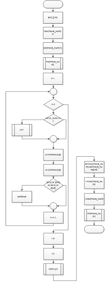 Виходячи з цього, кінь в позиції (i,j) може переміститися в позицію (i+ktmov [k], j+ktmov2 [k]), де k-значення з діапазону 1-8, що вибирається з умови, що кінь повинен бути на дошці.