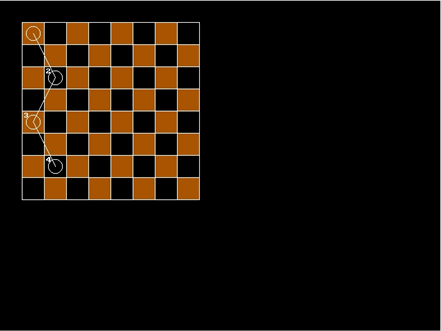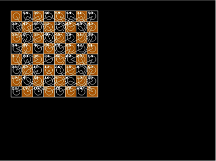Написати програму, яка реалізує рух коня по всім 64 кліткам шахової дошки так, щоб він сходив на кожне поле по одному разу. Розробити алгоритм з відходами назад. Необхідно, щоб рух коня спостерігався під час роботи програми. На пройдених клітках шахової дошки записуються номери ходів.