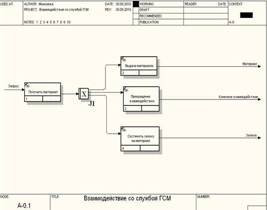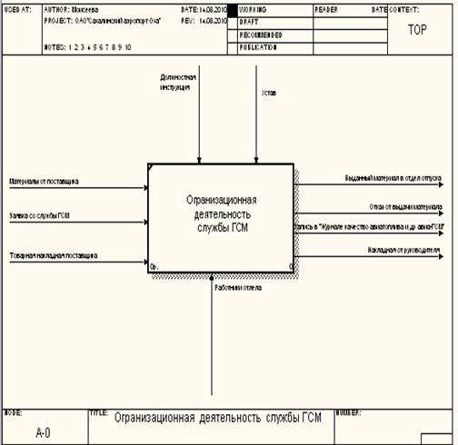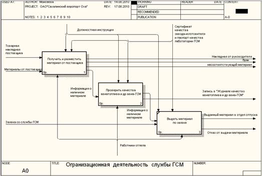 Третьей функцией является выдача материала по заявке в службу ГСМ. Входом является сама заявка, которая приходит из отдела отпуска авиа-ГСМ. Выходом служит следующее: выданный по заявке материал, сообщение о том, что в службе ГСМ отсутствует что-то из списка, который содержался в заявке. Сначала работник службы ГСМ получает заявку из отдела отпуска, а затем уже он начинает собирать материал по заявке. Результатом этого будет переданный в службу ГСМ материал и, в случае необходимости, содержащие информацию сообщение о тех материалах, которых не оказалось в наличии.