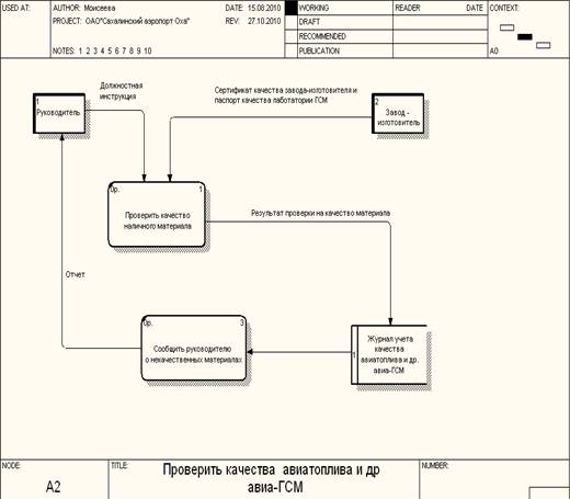 Второй функцией является проверка качества авиатоплива и др. авиа-ГСМ. В качестве входа можно рассматривать ту информацию о наличном материала, которой располагают работники отдела на момент проверки. А выходом является запись в “Журнале качества авиатоплива и др. авиа-ГСМ”.