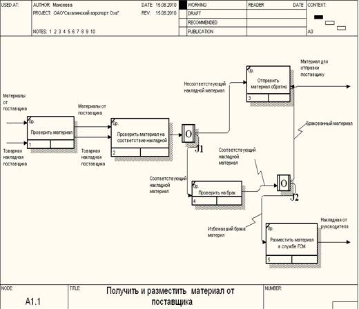 Диаграмма на рисунке 10 имеет три взаимосвязанных функции. Первой функцией является получение материалов от поставщика и его последующее размещение в отделе. Входом для функции является поступивший материал и накладная на этот материал, а выходом служит несколько элементов: товарная накладная для руководителя, бракованный и несоответствующий накладной материалы, которые отсылаются обратно поставщику. Все это, конечно же, требует проверки материала сразу по поступлению. Тот материал, который прошел проверку, остается и размещается в отделе.