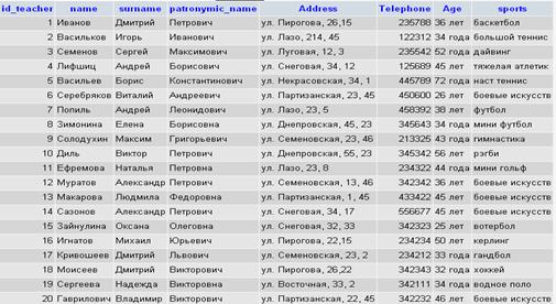 - Информационная таблица обо всех тренерах (Ф.И.О., адрес, телефон, возраст);
