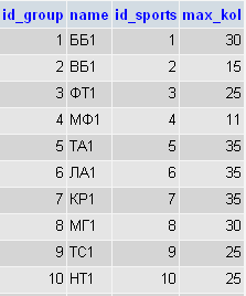 | Vid sporta | Varchar (15) | Вид занятий | ||