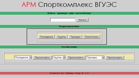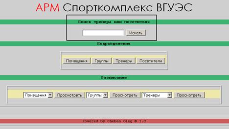 Снизу (Рисунок 9) изображено главное меню системы, рамкой выделена форма поиска тренеров и посетителей по фамилиям. Что бы воспользоваться поиском необходимо заполнить одно единственное поле формы, а затем нажать кнопку «Искать». При неверном занесении данных или не заполнении поля, поисковая система не будет работать.