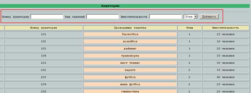 - Информационная таблица обо всех помещениях (название помещения, вид занятия, этаж);