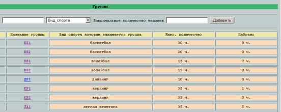 При добавлении группы необходимо заполнить два поля и выбрать значение поля со списком. В первое из полей вводится название группы, во второе поле вводится число максимального количества человек в группе Рисунок (13). В поле со списком выбирается вид занятий. Форма добавления обозначена красной рамкой. Ниже расположен список всех групп и информация о них.