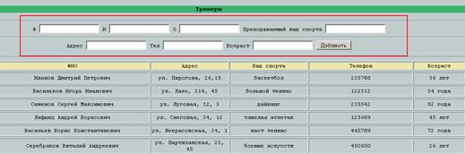 При добавлении тренера необходимо заполнить семь полей. Первые три поля предназначены для введения Ф.И.О.. В четвертое поле вводится специализация тренера (что преподает тренер). В последние (нижние) три поля вводится информация о месте проживания тренера, телефоне и возрасте (Рисунок 14), форма добавления обозначена рамкой.