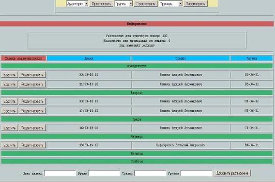 После того как мы выбрали нужную нам аудиторию или группу и тренера, нажимаем кнопку «Просмотреть» и нам выводится расписание для выбранного элемента (Рисунок 17).