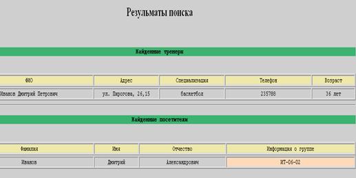 При занесении правильной информации, осуществляется поиск и выводятся результаты поиска (Рисунок 10), если же в результате выводятся пустые таблицы, значит, в базе данных не существует записи по вашему запросу.