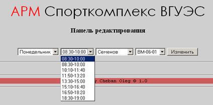 Меню редактирования записей в расписании (Рисунок 19). Благодаря нему можно редактировать существующее расписание. Необходимо обязательно выбрать значения из четырех полей со списком. После чего нажимаем кнопку «Изменить» и запись редактируется.