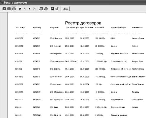| Список реквизитов | Рег.номер,юрид.номер,контрагент, дата договора, предмет договора, сумма договора, дата регистрации |