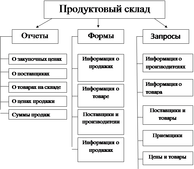В состав база данных «Продуктовый склад» входит главная форма, с помощью которой можно запустить отчеты, запросы, формы редактирования.