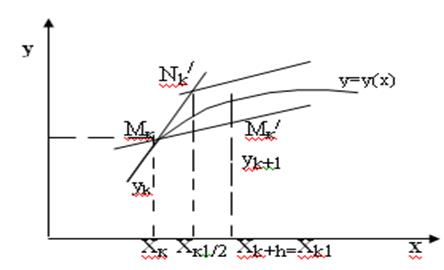 Сначала вычисляют вспомогательные значения искомой функции ук+1/2 в точках хк+1/2 , затем находят значение правой части уравнения (11) в средней точке y/ k +1/2 =f(xk +1/2 , yk +1/2 ) и определяют ук+1 .