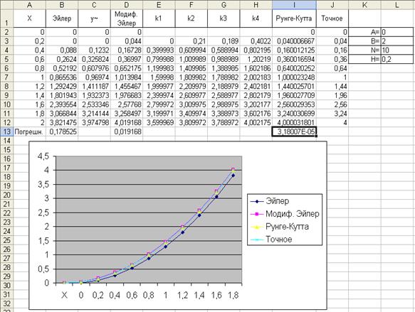 Метод Эйлера относиться к численным методам, дающим решение в виде таблицы приближенных значений искомой функции у(х). Он является сравнительно грубым и применяется в основном для ориентировочных расчетов. Однако идеи, положенные в основу метода Эйлера, являются исходными для ряда других методов.
