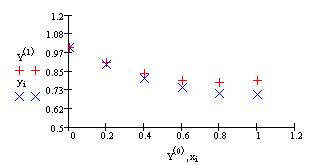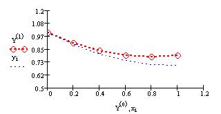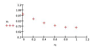 Для того чтобы построить график приближенного решения, щелкните в панели Graph по пиктограмме декартова графика, введите в помеченной позиции возле оси абсцисс имя первого столбца матрицы Y, содержащего значения x в узлах сетки, а в позиции возле оси ординат - имя второго столбца, содержащего значения приближенного решения в узлах сетки; затем щелкните по свободному месту в рабочем документе вне поля графиков.