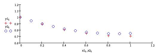 При решении задачи с шагом h=0.1 назовем шаг h2, аргумент - x2, а решение - y2.