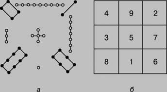 Магический квадрат – древнекитайского происхождения. Согласно легенде, во времена правления императора Ю (ок. 2200 до н.э.) из вод Хуанхэ (Желтой реки) всплыла священная черепаха, на панцире которой были начертаны таинственные иероглифы (рис. 1, а), и эти знаки известны под названием ло-шу и равносильны магическому квадрату, изображенному на рис. 1, б. В 11 в. о магических квадратах узнали в Индии, а затем в Японии, где в 16 в. магическим квадратам была посвящена обширная литература. Европейцев с магическими квадратами познакомил в 15 в. византийский писатель Э.Мосхопулос. Первым квадратом, придуманным европейцем, считается квадрат А.Дюрера (рис. 2), изображенный на его знаменитой гравюре Меланхолия 1. Дата создания гравюры (1514) указана числами, стоящими в двух центральных клетках нижней строки. Магическим квадратам приписывали различные мистические свойства. В 16 в. Корнелий Генрих Агриппа построил квадраты 3-го, 4-го, 5-го, 6-го, 7-го, 8-го и 9-го порядков, которые были связаны с астрологией 7 планет. Бытовало поверье, что выгравированный на серебре магический квадрат защищает от чумы. Даже сегодня среди атрибутов европейских прорицателей можно увидеть магические квадраты.