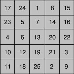 Магические квадраты нечетного порядка можно построить с помощью метода французского геометра 17 в. А.де ла Лубера. Рассмотрим этот метод на примере квадрата 5-го порядка (рис. 4). Число 1 помещается в центральную клетку верхней строки. Все натуральные числа располагаются в естественном порядке циклически снизу вверх в клетках диагоналей справа налево. Дойдя до верхнего края квадрата (как в случае числа 1), продолжаем заполнять диагональ, начинающуюся от нижней клетки следующего столбца. Дойдя до правого края квадрата (число 3), продолжаем заполнять диагональ, идущую от левой клетки строкой выше. Дойдя до заполненной клетки (число 5) или угла (число 15), траектория спускается на одну клетку вниз, после чего процесс заполнения продолжается.