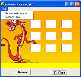 1.1.1 TMainMenu – главное меню формы, Name – MainMenu1 (Содержит один пункт меню «Help» (Name – Help1) с двумя пунктами подменю «Магический квадрат» (Name – N1) и «Правила игры» (Name – N2)).