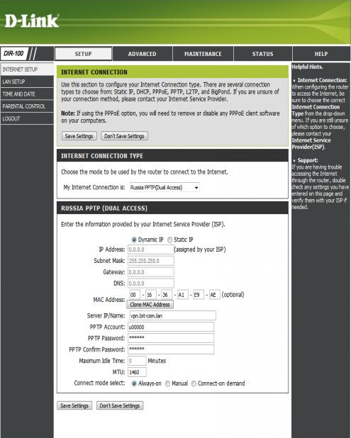 1) ВполеMy Internet Connection is выбираемRussia PPTP (Dual Access) .