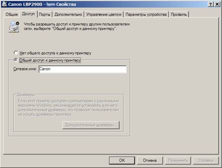 Заходим в панель управления, там в «Принтеры и факсы» . Кликаем правой кнопкой мыши по значку установленного принтера и выбираем в выпавшем меню «Свойства» . Переключаемся на вкладку «Доступ» , нажимаем «Общий доступ к данному принтеру» , даем название этому принтеру «Canon» и нажимаем «ОК» . На значке должна появиться держащая рука – значит все в порядке.