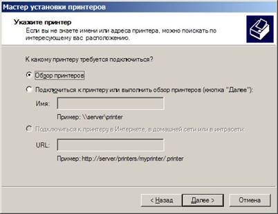Теперь надо подключить и настроить сетевой принтер на других компьютерах. Для этого в «Принтерах и факсах» запускаем мастера подключения принтеров, даем указание мастеру установить сетевой принтер.