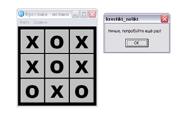 Кроме выигрыша и проигрыша, есть возможность ничьи. Для этого проверяется игра на заполнение поля, после проверок на все возможные выигрыши. Выводитсясообщениеоничьеитакжеочищаетсяполеигры.