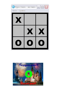 Начало игры выполняется с процесса нажатия на поле левым щелчком мыши. Выполняем ход, в ответ на наш ход программа в начале начинает ходить наугад. В итоге мы выигрываем: