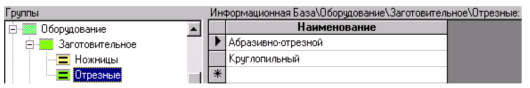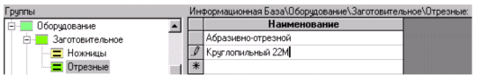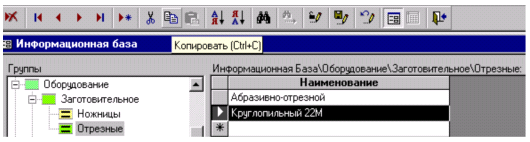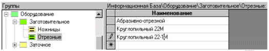 Если в ИБ нет необходимого оборудования или модели оборудования, то его можно ввести, включая ввод новых классификационных признаков. Например, добавим модель оборудования в имеющуюся строку данных и добавим оборудование другой модели. Для этого необходимо поставить курсор в конец строки «Круглопильный» и набрать на клавиатуре его модель.