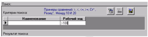 Например, необходимо найти тиски с величиной рабочего хода не менее 100 мм. Введите критерий ”>100” в поле параметра «Рабочий ход».