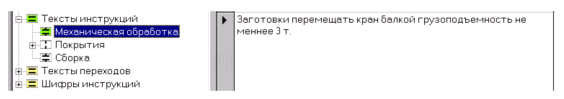 В текстах инструкций можно указывать переменные, которые будут заменяться на значения параметров детали или технологического процесса. Над строками текстов инструкций имеется две кнопки [Ввод] и [Текст]. Если нажата кнопка [Ввод], то виден текст инструкции до замены переменных и при изменении его с клавиатуры он будет запоминаться в ИБ, как новый текст инструкции. Если нажата кнопка [Текст], то виден текст инструкции с замененными переменными, именно этот текст будет выдаваться в карты ТП и изменения, введенные в него с клавиатуры сохраняются только в КТП. Замена переменных на их значения происходит после нажатия кнопки [Пересчитать] в окне КТП.