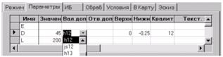 Другим способом ввода допусков на размер является вызов таблицы полей допусков. Вызов таблицы производится двойным щелчком по полю «Квалитет» или по полям: «Вал.доп.», «Отв.доп.», «Верхний», «Нижний» в строке параметра.