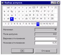 В появившейся табличке надо выбрать требуемое поле допуска и затем квалитет. После выбора кнопки [OK] поле допуска и отклонения будут внесены в соответствующие поля.