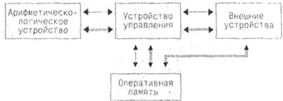 В общих чертах работу компьютера можно описать так. Вначале с помощью какого-либо внешнего устройства в память компьютера вводится программа. Устройство управления считывает содержимое ячейки памяти, где находится первая инструкция (команда) программы, и организует ее выполнение. Эта команда может задавать выполнение арифметических или логических операций, чтение из памяти данных для выполнения арифметических или логических операций или запись их результатов в память, ввод данных из внешнего устройства в память или вывод данных из памяти на внешнее устройство.