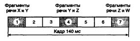 Перемежение - пакет из 260 бит подвергается перемежению. Любой речевой фрагмент разбивается на две равные части. Одна из этих частей передается в исходном окне фрагмента, а другая - в окне, сдвинутом на три окна (например, в окнах I" и 4). Следующий фрагмент речи, длительностью 20 мс, передается в окне 4 и в окне 1 в следующем кадре.