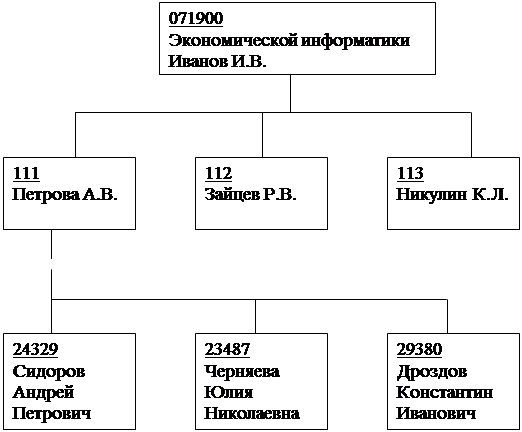Пример, представленный на рисунке 2 иллюстрирует использование иерархической модели базы данных. Для рассматриваемого примера иерархическая структура правомерна, т.к. каждый студент учится в определённой (только одной) группе, которая относится к определённому (только одному) институту.