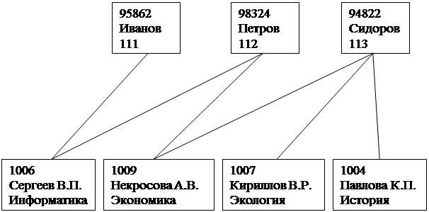 Примером сложной сетевой структуры может служить структура базы данных, содержащей сведения о студентах, участвующих в научно – исследовательских работах (НИР). Возможно участие одного студента в нескольких НИР, а также участие нескольких студентов в разработке одной НИР. Графическое изображение описанной в примере сетевой структуры, состоящей только из двух типов записей, показано на рисунке 4. Единственное отношение представляет собой сложную связь между записями в обоих направлениях.