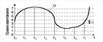 Процесс дискретизации заключается в том, что из непрерывного во времени сигнала (в рассматриваемом случае таким сигналом является напряжение) выбираются отдельные его значения, соответствующие тактовым моментам времени, следующим через определенный временной интервал Т, называемый тактовым интервалом. Операция квантования состоит в округлении значений аналогового напряжения, выбранных в тактовые моменты времени, до ближайшего уровня квантования (рисунок 1). Уровни квантования сдвинуты друг относительно друга на величину Δ, называемую шагом квантования. Каждому уровню квантования присваивается порядковый номер (0, 1, 2, 3 и т.д.).