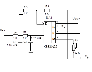 Принципиальная схема активного ФНЧ представлена на рисунке 4. резистор R5 служит для установки 0.