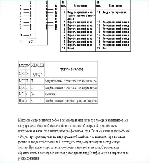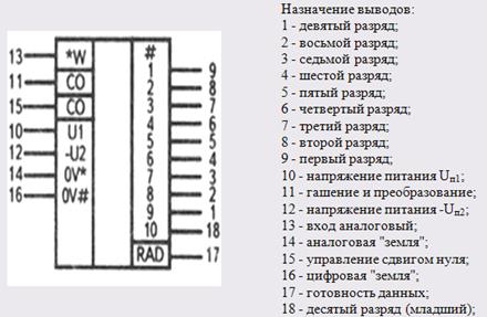 Микросхема представляет собой функционально законченный 10-разрядный АЦП [2], сопрягаемый с микропроцессором. Обеспечивает преобразование как однополярного напряжения (вывод 15 соединяется с выводом 16) в диапазоне 0...9,95 В, так и биполярного напряжения в диапазоне -4,975...+4,975 В в параллельный двоичный код. В состав ИС входят ЦАП, компаратор напряжения регистр последовательного приближения (РПП), источник опорного напряжения (ИОН), генератор тактовых импульсов (ГТИ), выходной буферный регистр с тремя состояниями, схемы управления. Выходные каскады с тремя состояниями позволяют считывать результат преобразования непосредственно на шину данных микропроцессора. По уровням входных и выходных логических сигналов сопрягаются с ТТЛ-схемами. В ИС выходной ток ЦАП сравнивается с током входного резистора от источника сигнала и формируется логический сигнал РПП. Стабилизация разрядных токов ЦАП осуществляется встроенным ИОН. Тактирование РПП обеспечивается импульсами встроенного ГТИ с частотой следования 300...400 кГц. Установка РПП в исходное состояние и запуск его в режим преобразования производится по внешнему сигналу "гашение и преобразование". По окончанию преобразования АЦП вырабатывает сигнал "готовность данных" и информация из РПП поступает на цифровые входы через каскады с тремя состояниями.