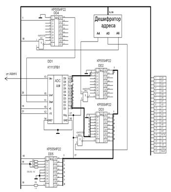 Схема подключения блока АЦП к МПС представлена на рис. 7. Микросхемы DD2 и DD3 регистры для старших разрядов данных и младших соответственно. Их входы соединены непосредственно с выходами микросхемы АЦП, а выходы идут на шину данных. Запись происходит при готовности АЦП- сигналом Rdy и сигналом от дешифратора на вход С регистров.