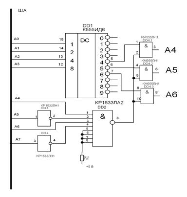Для "отлавливания" А используется "И" и "НЕ" - DD2, DD3, для 4,5,6 дешифратор на микросхеме КМ555ИД6: