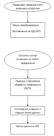 Данные поступают на шину данных. DD4- регистр для хранения управляющего сигнала для АЦП, поступающего с шины данных, записываемого при поступлении сигнала от дешифратора и сигнала разрешения прерывания INTA на вход С микросхемы. При разрешении программой работы, на адрес А4 записывается бит разрешения работы АЦП. Этот бит передается в микросхему АЦП на вход разрешения работы Start. После преобразования на АЦП появляется сигнал готовности Rdy, который вызывает прерывание и разрешает запись в регистры DD3, DD2. DD5 формирует прерывание RST3. При поступлении INTA на вход Z, на шине данных формируется сигнал RST3.