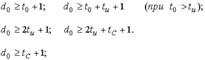 Кодовое расстояние между двумя кодовыми словами (расстояние Хэмминга) - это число позиций, в которых они отличаются друг от друга. Кодовое расстояние кода - это наименьшее расстояние Хэмминга между различными парами кодовых слов. Основные зависимости между кратностью обнаруживаемых ошибок t0 , исправляемых ошибок tu , исправлением стираний tc и кодовым расстоянием d0 кода: