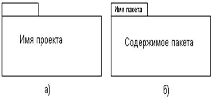 Для графического изображения пакетов на диаграммах применяется специальный графический символ — большой прямоугольник с небольшим прямоугольником, присоединенным к левой части верхней стороны первого. Внутри большого прямоугольника может записываться информация, относящаяся к данному пакету. Если такой информации нет, то внутри большого прямоугольника записывается имя пакета, которое должно быть уникальным в пределах рассматриваемой модели (рисунок1, а). Если же такая информация имеется, то имя пакета записывается в верхнем маленьком прямоугольнике (рисунок1, б).