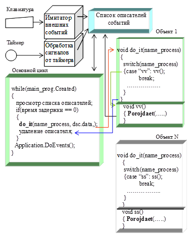 Все классы приложения подразделяются на активные и пассивные. Активные классы реагируют на события, внешние или возникающие внутри приложения. Кратким и емким определением события, известным в литературе, является следующее: «Событие – это нарушенное однообразие». В аппаратуре события представляются сигналами прерываний. В ОС Windows для представления событий используются сообщения (message). Результатом реагирования на событие является вызов процедуры обработки прерывания. Поэтому в приложении реагирование на события можно реализовать как вызов соответствующего обработчика события. При моделировании динамики поведения реальных объектов необходимо учитывать конечную скорость протекания процессов в этих объектах. Вследствие этого моменты возникновения события и реакции на него разделены во времени. Реализация задержек реакции на некоторое событие требует введение специальных структур данных для задания и хранения информации о событии, обработчик которого необходимо вызвать по истечении времени задержки.